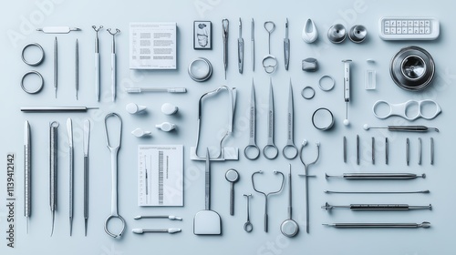 Fototapeta premium Medical instruments: Tools like forceps and other surgical instruments. Medical charts. Miscellaneous equipment: Items such as a blood pressure cuff, a thermometer, and other diagnostic tools.