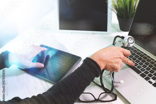 © everythingpossible, Fototapeta premium Medical network technology concept. Doctor hand working with ste