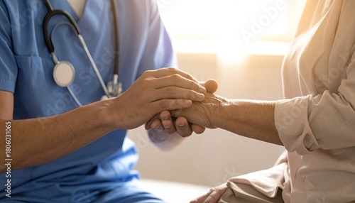 © Pp, Obraz premium Medical Professional Comforting Patient in Blue Scrubs with Stethoscope Offering Support and Care Holding Hands in Warm Sunlight in Healthcare Setting