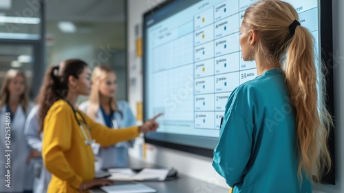 Obraz premium Medical professionals collaborating on hospital scheduling on a digital screen