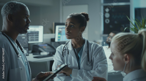 Fototapeta premium Medical professionals engage in a thoughtful discussion in a high-tech lab.