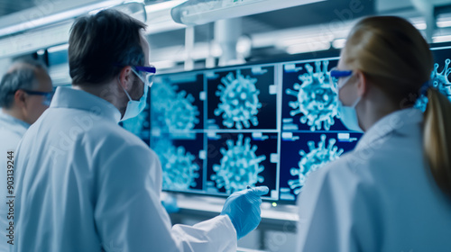 © fotogurme, Obraz premium Medical researchers discussing bird flu data on a large screen, lab setting, focus on the screen and data