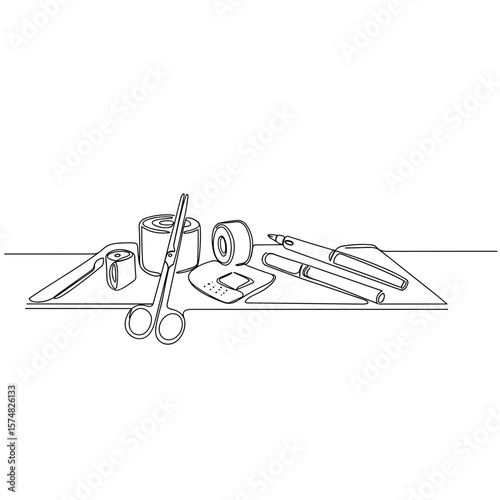 © Nii_Anna, Fototapeta premium Medical scissors and bandages on table with pens and tape