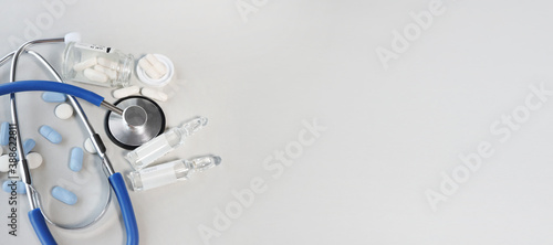 © Svetlana, Fototapeta premium Medical stethoscope on a gray background with pills. Coronavirus pandemic new normal concept top view banner