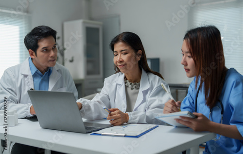 © Phimwilai, Obraz premium Medical team analyzing data on laptop in hospital meeting