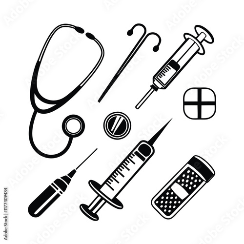 © Designbundle, Obraz premium medical tools icons set silhouette vector