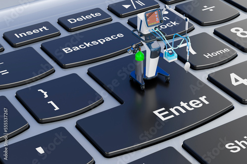 Fototapeta premium Medical ventilator on laptop keyboard, 3D rendering