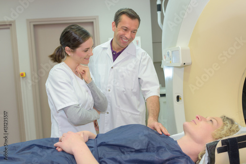 © auremar, Obraz premium Medical workers reassuring patient entering mri scanner