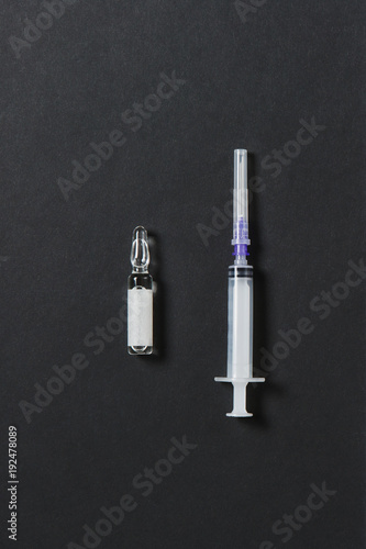 Naklejka premium Medication ampoule, empty syringe needle on black background. Health,...