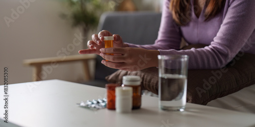 © Natee Meepian, Obraz premium Medication Management. Woman holding prescription bottle, contemplating health.