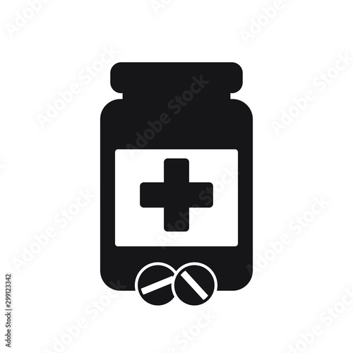 © Maksim, Obraz premium Medicine bottle and pills. Black and white icon. Vector illustration
