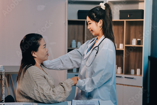 Fototapeta premium Medicine doctor hand reassuring her female patient