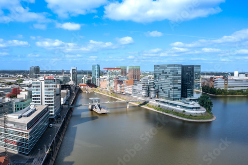 © shokokoart, Obraz premium Medienhafen aus der Vogelperspektive, Düsseldorf, Deutschland.