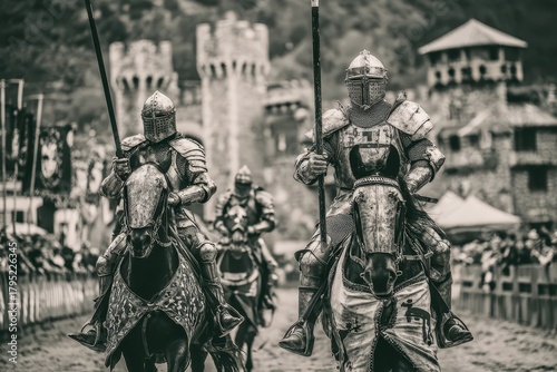 Fototapeta premium Medieval armored knights on horseback with lances, castle backdrop, monochrome.