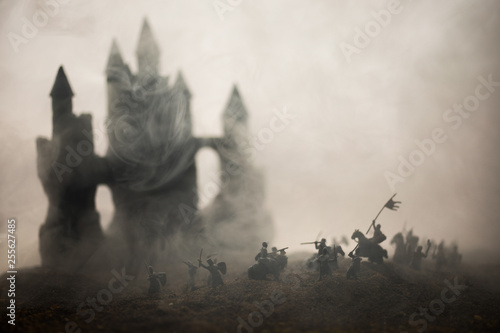 Obraz premium Medieval battle scene with cavalry and infantry. Silhouettes of figures as separate objects, fight between warriors on sunset foggy background.