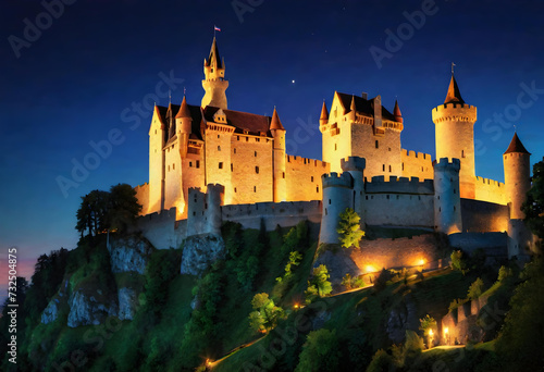 © Say it with silence., Fototapeta premium Medieval Castle, Fortification, Architecture, Historical, Ancient, Fortress, Stronghold, Stone, Tower, Ramparts, History, Heritage, Medieval Era, Kingdom, AI Generated