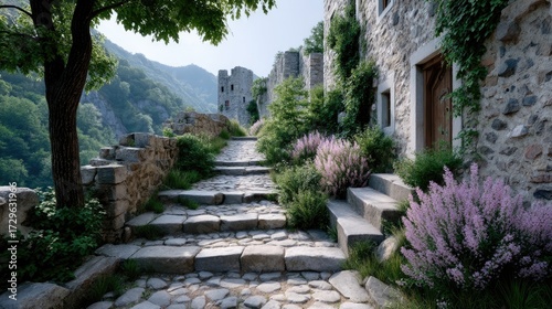 © Tiyu, Naklejka premium Medieval Castle Ruins With Stone Steps And Lush Vegetation At Sunny Day