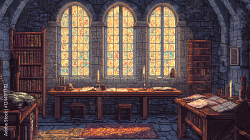 © Onirama, Obraz premium Medieval Castle Scriptorium with Illuminated Manuscripts