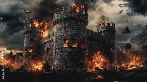 Fototapeta premium Medieval Castle Under Siege with Soldiers and Catapults