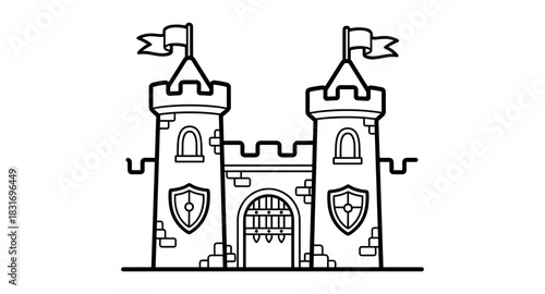 Naklejka premium Medieval castle with two towers and flags in linear style
