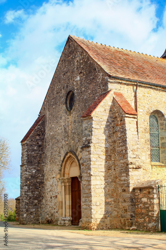 © Bruno, Fototapeta premium Medieval church in pale stone with carved gothic style porch View of a place of Christian religious worship in the countryside