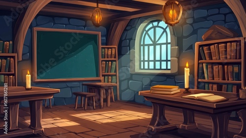 Naklejka premium Medieval classroom with stone walls, bookshelves, chalkboard, tables, and candles.