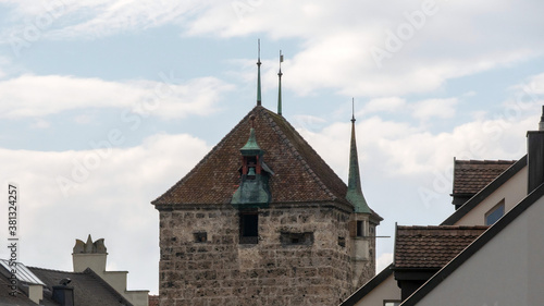 © djenev, Fototapeta premium Medieval defense tower with embrasure and bell