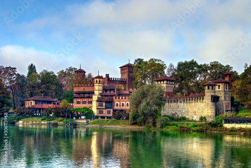 © Marco, Naklejka premium Medieval fortress in Valentino Park, Turin, Piedmont. The buildings, built as a pavilion of the Italian General Exhibition in Turin in 1884, represent castles from the 15th century. Autumn view.