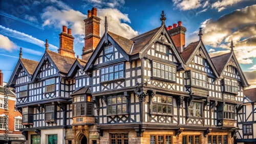 © Kitiphong, Obraz premium Medieval half-timbered house in Chester city center with a stone fa?ade and ornate chimneys