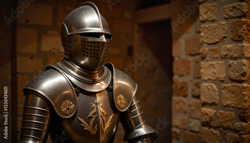 Fototapeta premium Medieval knight armor showcased in dimly lit room, historical elegance