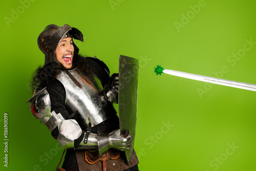 Naklejka premium Medieval knight in armor humorously defending against a symbolic virus on bright green background