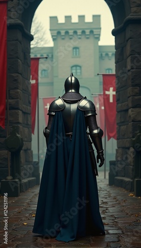 Naklejka premium Medieval knight in armor walking through fortress gate with red banners