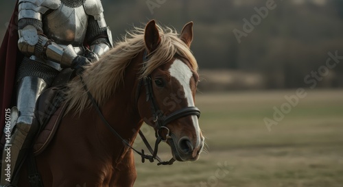 © dreamdes, Obraz premium Medieval knight in shining armor riding chestnut horse with white blaze marking. Historical reenactment scene with armored warrior in metal plate and chainmail on battlefield. Ancient warfare concept.