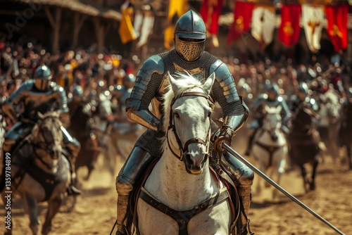 © Gatherina, Fototapeta premium Medieval knights jousting on horseback in tournament with lance and armor