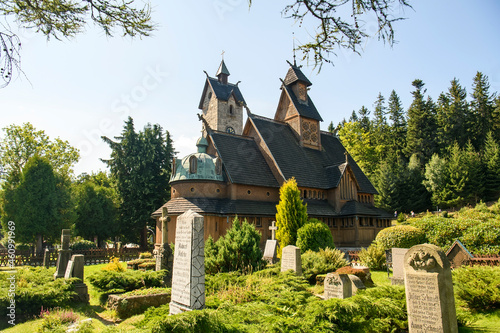 © vlamus, Fototapeta premium Medieval Norwegian stave wooden church Vang or Wang, which was transferred from Vang in Norway to Karpacz, Poland