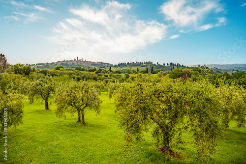 Naklejka premium Medieval San Gimignano hill town with skyline of medieval towers, including...