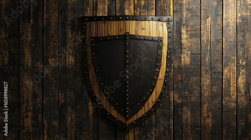 Fototapeta premium Medieval shield on a wooden backdrop evoking ancient tales and brave knights protection and history