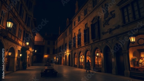 © Oleh, Obraz premium Medieval Square Illuminated by Warm Lights