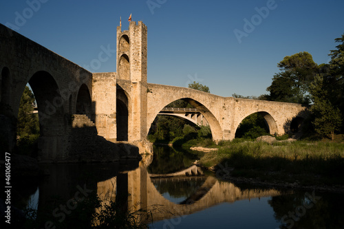 © Diego, Fototapeta premium Medieval stone bridge over river at sunset, Besalu Catalonia, Spain