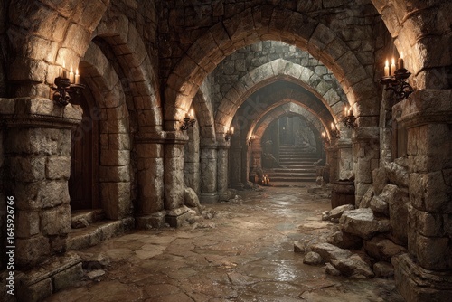 © Ehsan, Fototapeta premium Medieval stone passageway. Arched corridors, light filtering, ancient