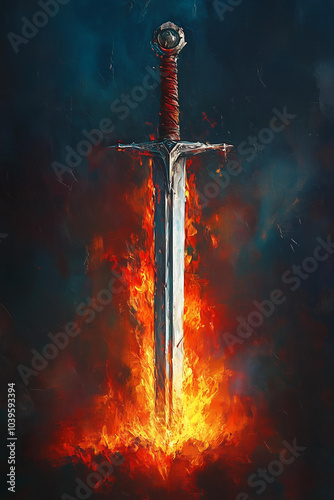 Naklejka premium medieval sword, with its blade raised and the hilt glowing in an intense red flame, stands tall against a dark background.