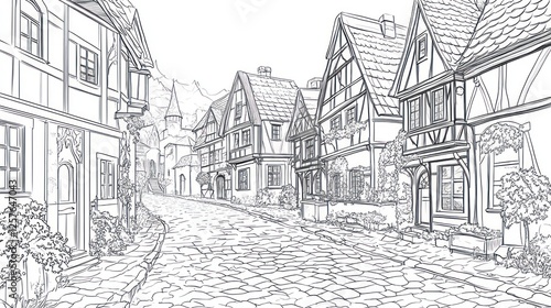 Fototapeta premium Medieval town street, cobblestone road, half-timbered houses, idyllic setting, coloring book