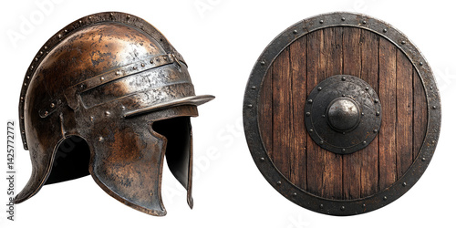 © Aqna, Fototapeta premium Medieval warrior helmet and round wooden shield isolated on transparent background perfect for historical and battle-themed visuals
