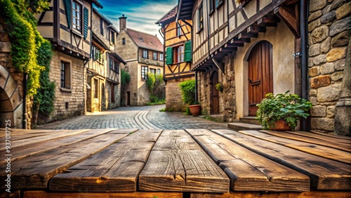 © Kukar Studio, Fototapeta premium Medieval wooden platform situated in a cobblestone street of a charming village
