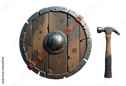 Naklejka premium Medieval Wooden Shield and Rustic Hammer