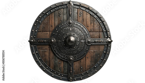 © ceren, Naklejka premium Medieval wooden shield isolated on white. Old viking wooden shield .