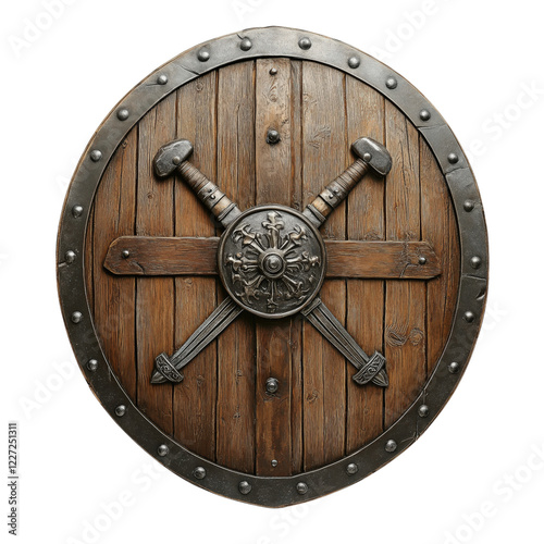 © Uwe, Fototapeta premium Medieval wooden shield with steel reinforcements and crossed swords, featuring a rustic design, isolated on a transparent background. Perfect for historical and fantasy themes.