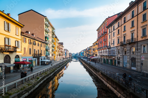 © Jan Cattaneo, Fototapeta premium Mediolan, Navigli (Darsena) ludzie spacerujący nad brzegiem kanału w słoneczny zimowy dzień