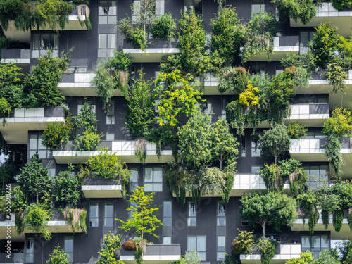 Fototapeta premium Mediolan, Włochy. Bosco Verticale, widok z bliska na nowoczesne i ekologiczne wieżowce z wieloma drzewami na każdym balkonie. Nowoczesna architektura, ogrody wertykalne, tarasy z roślinnością