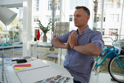 Naklejka premium Meditating man holding prayer pose at home office desk, with sketchbook and...